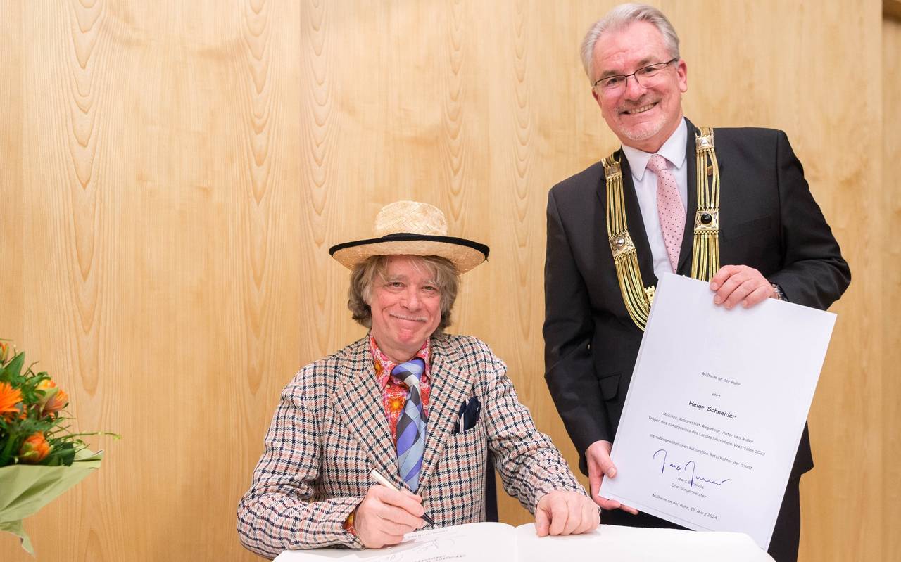 Auslöser für die Ehrung war die Auszeichnung des Mülheimer Kabarettisten und Musikers mit dem Kunstpreis des Landes NRW im November. Mülheims Oberbürgermeister Marc Buchholz lud Schneider daraufhin ein, sich erneut ins Goldene Buch einzutragen. Das hatte der Künstler schon einmal gemacht, im Jahr 2005. In das Goldene Buch dürfen sich Gäste und besondere Persönlichkeiten auf Einladung eintragen. Das haben schon u.a. die frühere Bundeskanzlerin Angela Merkel oder auch Stuart A. Roosa, Astronaut an Bord der 14. Apollo-Mission getan.