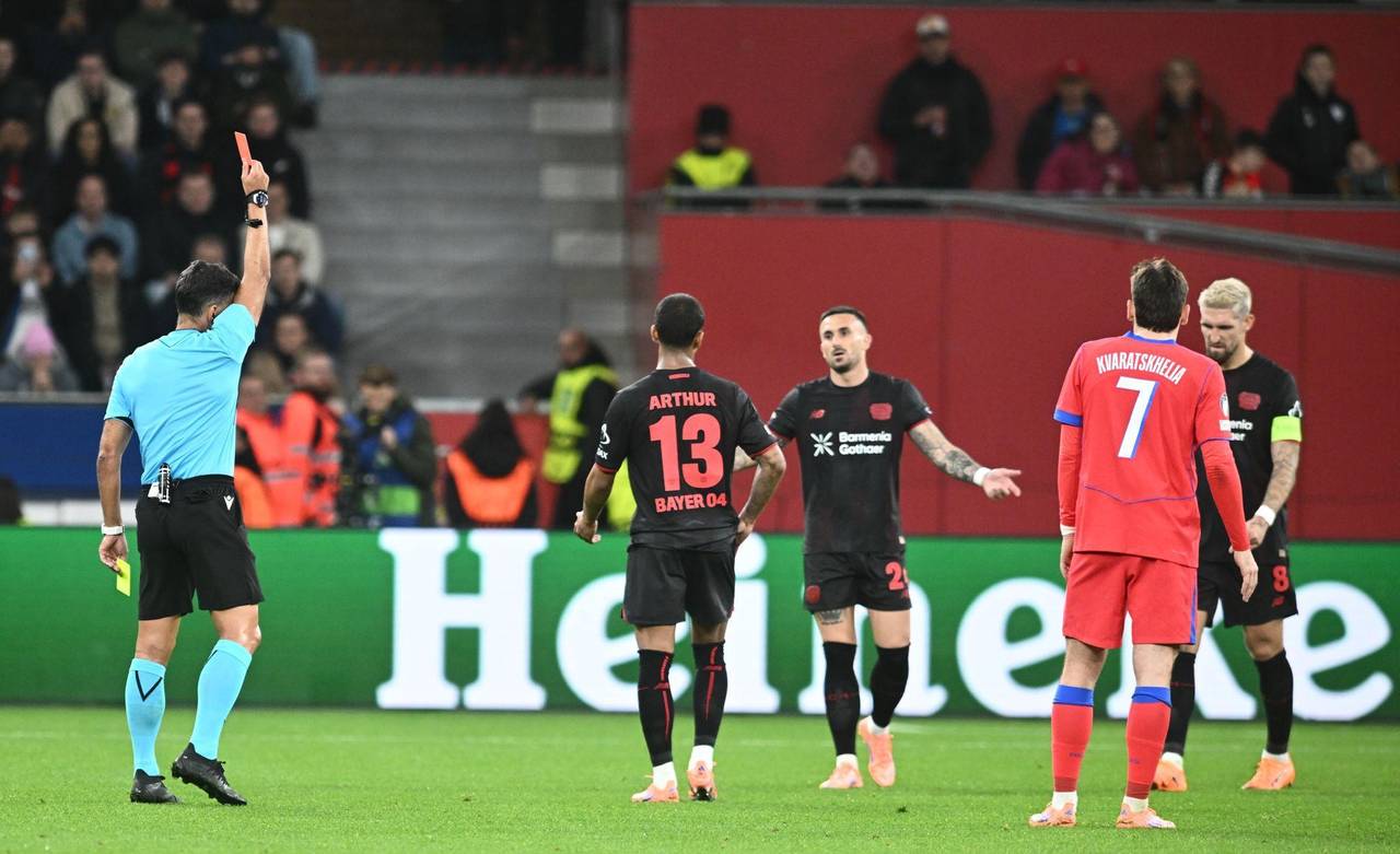 Die Werkself fand trotz dieses Rückschlags immer besser ins Spiel, wurde aber jäh gestoppt: Kapitän Robert Andrich traf Doué unglücklich am Kopf, sah zunächst Gelb und flog nach VAR-Überprüfung mit Rot vom Platz (31.). Doch die Überzahl der Gäste hielt nur kurz, denn bei PSG sah Zabaryani nur fünf Minuten später für eine Notbremse Rot (37.).