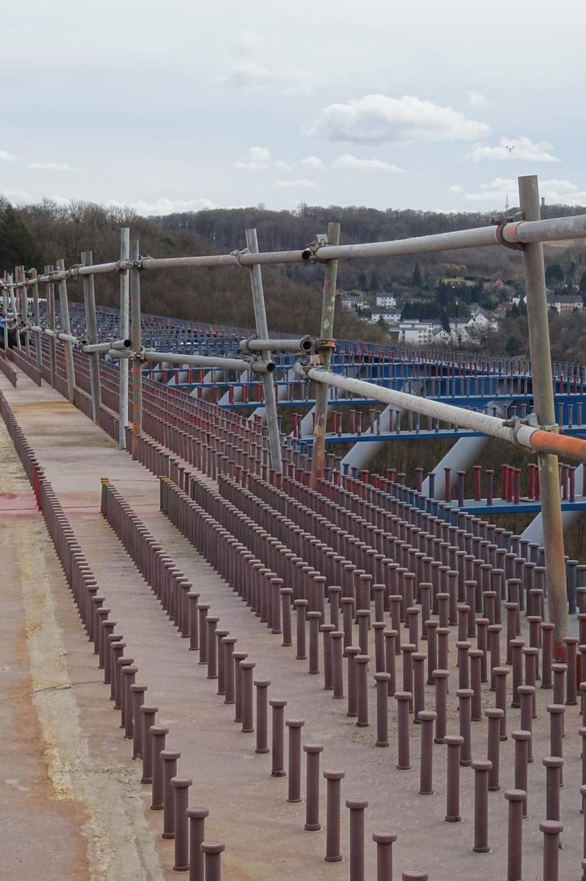 Wissing war ins Sauerland gekommen, um sich ein Bild vom Baustellenfortschritt zu machen: Seit mehreren Monaten wird der stählerne Überbau von beiden Seiten des Tales Stück für Stück über die Pfeiler geschoben. Nun sind beide Teile nur noch wenige Meter voneinander entfernt und sollen zeitnah miteinander verbunden werden, wie es am Dienstag von der Autobahn GmbH hieß. Der Brückenbauer spricht in so einem Fall von der "Stahlhochzeit".