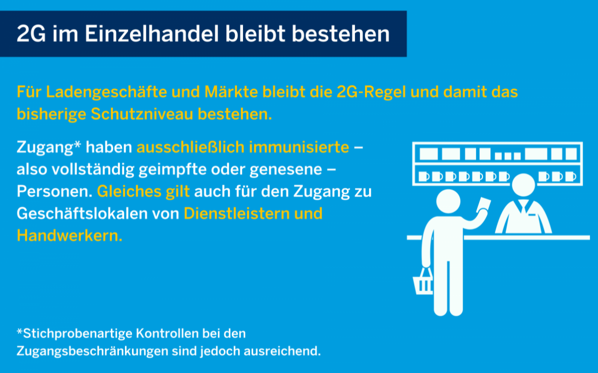 - 2G im Einzelhandel bleibt nur noch mit "stichprobenartigen Kontrollen" bestehen. Für Geschäfte und Märkte bleibt die 2G-Regel und damit das bisherige Schutzniveau bestehen: Zugang haben ausschließlich immunisierte – also vollständig geimpfte oder genesene – Personen. Künftig ist bei der Zugangsbeschränkung jedoch eine stichprobenartige Kontrolle ausreichend. Gleiches gilt auch für den Zugang zu Geschäftsräumen von Dienstleistern und Handwerkern.