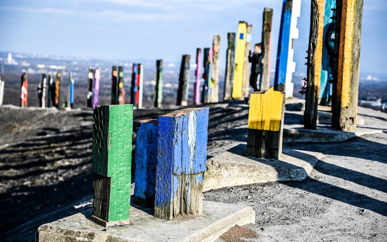 350 Arbeitsstunden hat es gekostet, alles wieder schön zu machen. Unbekannte hatten im März fünf der über Hundert Holzpfähle abgesägt und einen Hang hinuntergeworfen. Wer für den Vandalismus verantwortlich ist, ist nach wie vor unbekannt. Das Kunstwerk auf dem oberen Teil der Halde auf Bottroper Gebiet gilt als eines der bekanntesten im Ruhrgebiet. Es war 2002 vom baskischen Künstler Augustin Ibarrola aufgestellt und 2007 überarbeitet und an den heutigen Standort versetzt worden.
