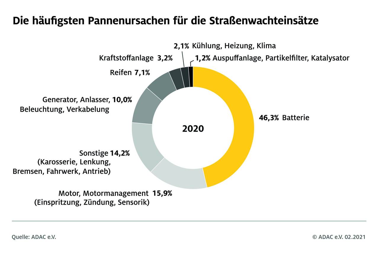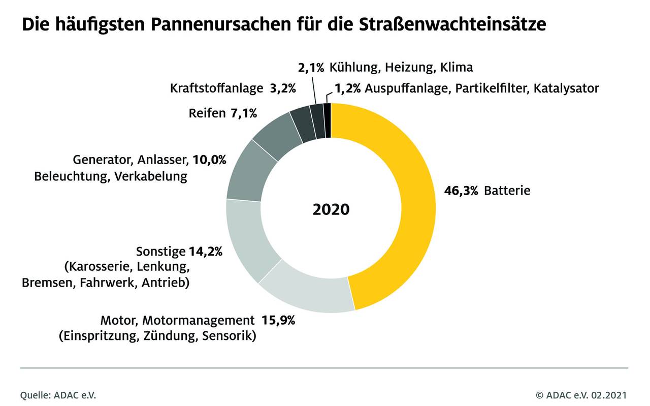Grund dafür: Wegen Corona und der Lockdowns hat auch der Verkehr abgenommen. Weniger Fahrzeuge auf der Straße bedeuten weniger Pannen und somit auch weniger Einsätze. Am häufigsten hatten es die "Gelben Engel" im letzten Jahr mit Batterie-Problemen (46,3%) zu tun. Die Fälle haben zugenommen. Das liegt daran, dass viele Autos im Lockdown lange gestanden haben und nicht bewegt worden sind, sagt der ADAC. Außerdem haben die zugelassenen Fahrzeuge bei uns mit 9,6 Jahren mittlerweile ein hohes Durchschnittsalter. Da kann immer mal was sein.