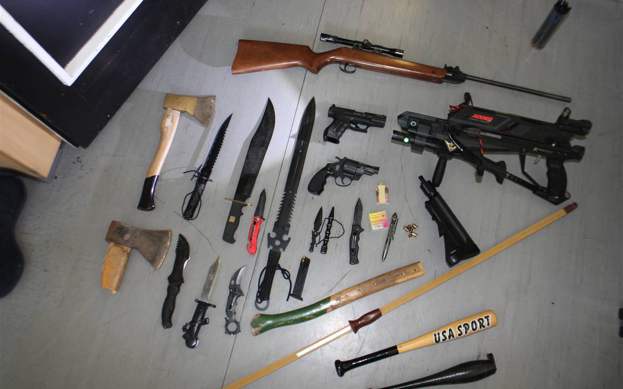 In seiner Wohnung fanden die Polizisten viele Messer, Schreckschusspistolen, ein Schwert, Äxte, einen Bogen und eine laservisierte Armbrust mit Pfeilen. Als sie dem Wohnungsinhaber sagten, dass die Waffen sichergestellt werden müssten, wehrte sich dieser heftig. Er musste gefesselt zur Begutachtung ins Krankenhaus gebracht werden. Stark betrunken war der Mann auch, ein Alkoholtest zeigte einen Wert von knapp zwei Promille.