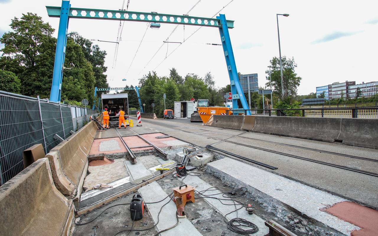 Die Stoag arbeitet aktuell in Oberhausen auf der Brücke über die Autobahn 516. Die Straßenbahn-Trasse der Linie 112 in dem Bereich muss dringend wieder in Schuss gebracht werden, heißt es. Diese und weitere Arbeiten laufen extra jetzt in den Sommerferien, weil dann weniger los ist.