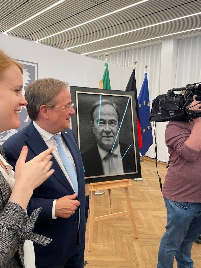 Das Porträt ist ein klassisches Schwarz-Weiß-Foto mit einer besonderen Note: Kleine, weiße Punkte durchziehen das Bild, während Laschets Gesicht scharf bleibt. Diese künstlerische Gestaltung stammt von Till Brönner, einem bekannten Jazz-Trompeter und Fotografen. Laschets Bild hängt nun in der Galerie der ehemaligen Ministerpräsidenten, ein Symbol dafür, dass Macht in der Demokratie nur auf Zeit verliehen wird, wie Hendrik Wüst betonte.