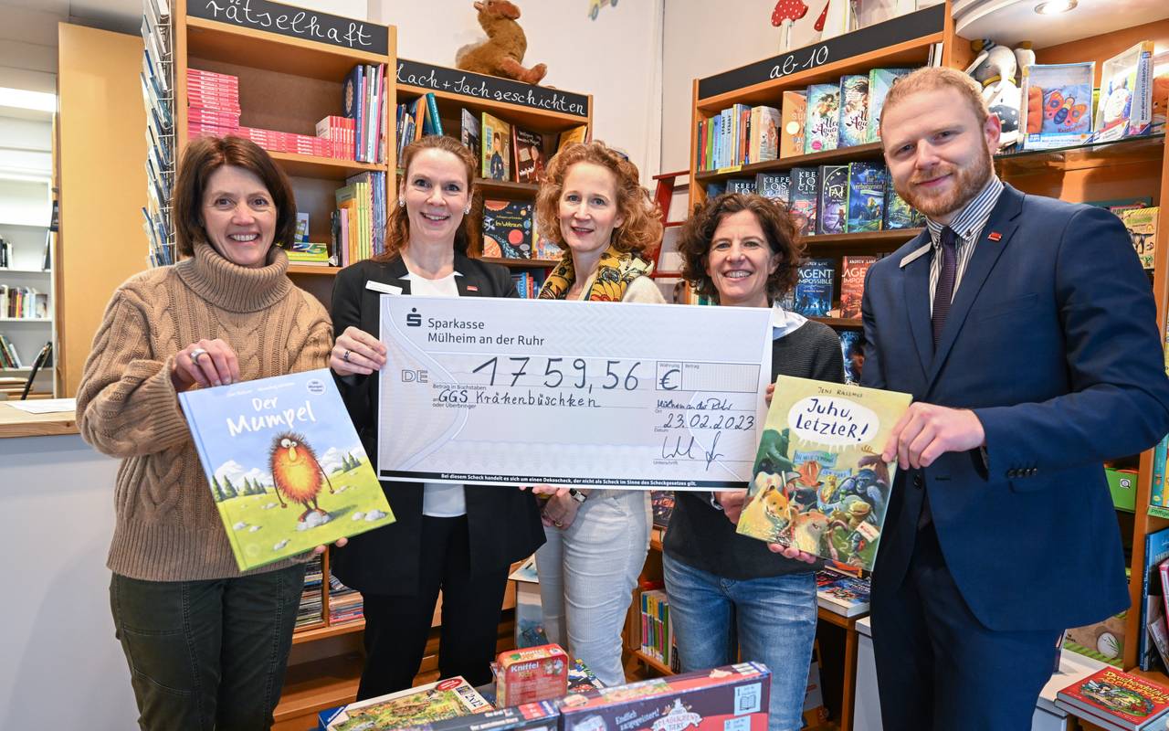 Fast 1.800 Euro Spenden hat die Buchhandlung Hilberath und Lange an die Schulbücherei der Krähenbüschkenschule überreicht. Kunden können bei ihrem Bucheinkauf schon seit Jahren aufrunden und damit eine Schulbücherei in Mülheim unterstützen.