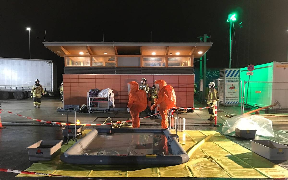 Er steuerte das Gespann auf den Parkplatz Schwarze Heide Richtung Oberhausen. Dort stellte er fest, dass ätzende Natronlauge austrat. Für die Feuerwehr Bottrop begann damit einer der längsten Einsätze der letzten Monate. Das Leck konnte nicht abgedichtet werden. Die Lauge musste aufgefangen werden. Mehrere Freiwillige Feuerwehren kamen zur Unterstützung. Umliegende Feuerwehren stellten zusätzliche Schutzanzüge zur Verfügung. Am frühen Morgen verschärfte sich die Lage, als der Tanklaster drohte auseinanderzubrechen. Mit einer Spezialpumpe gelang es schließlich, den Auflieger leer zu pumpen. Er kann 23.000 Liter Flüssigkeit fassen. Die Lauge wird jetzt von Spezialkräften des Chemieparks Marl abtransportiert. Wie lange der Einsatz noch dauern wird, ist unklar.