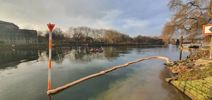 Mit einem Boot der Feuerwehr und einem der DLRG konnten die Einsatzkräfte an drei Punkten im Fluss eine 70 Meter lange sogenannte "Ölsaugsperre" anbringen. Dabei handelt es sich um einen gefüllten Vliesschlauch, der das Öl aus dem Wasser aufnimmt. Er sorgt außerdem dafür, dass sich die Verunreinigung nicht weiter ausbreiten kann.