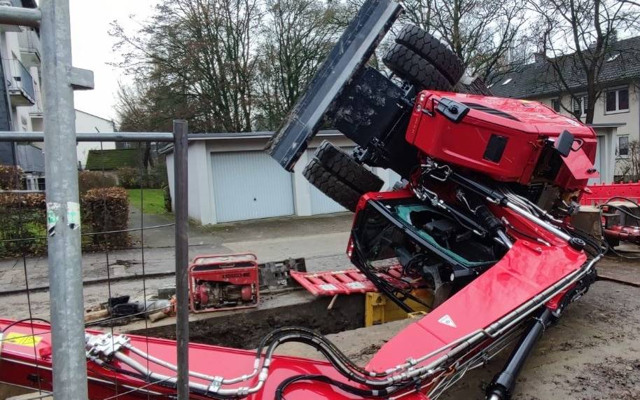 Heute Mittag (15.12.) ist in Broich ein recht ungewöhnlicher Arbeitsunfall passiert. Auf einer Baustelle in der Thüringer Straße ist ein Bagger in eine Baugrube gekippt.