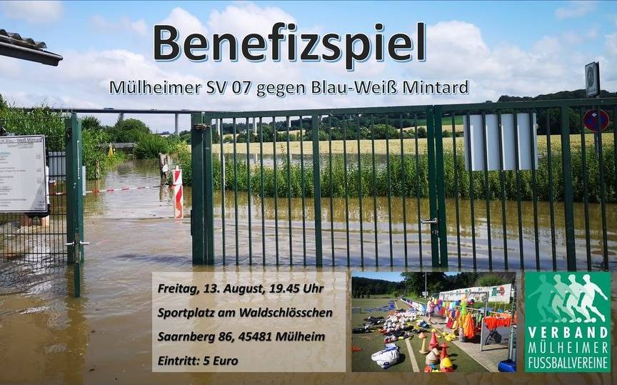 Mit einem Benefiz-Fußballspiel zwischen dem Mülheimer SV 07 und Blau-Weiß Mintard sollen weitere Spenden für die vom Hochwasser zerstörte Sportanlage in Mintard zusammenkommen. Das Spiel heute Abend (13.08.) am Waldschlößchen auf dem Saarnberg hat der Verband der Mülheimer Fußballvereine organisiert. Es startet um 19.45 Uhr.