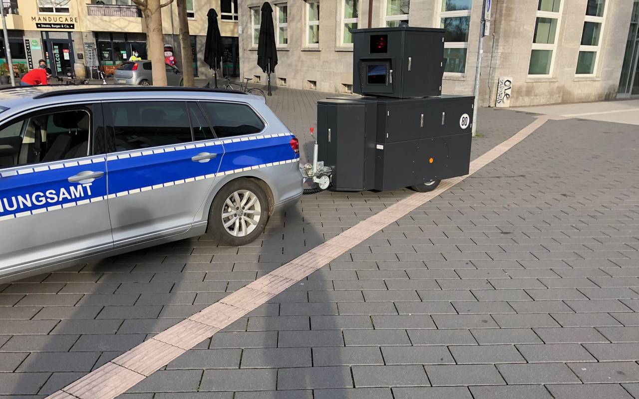 Das neue Gerät besteht aus einer großen schwarzen Blechkiste mit Rädern. Auf ihr drauf ist noch eine kleinere Kiste montiert. Das Ordnungsamt kann den Anhänger einfach hinter ein Fahrzeug hängen und da abstellen, wo geblitzt werden soll. Er funktioniert mit moderner Lasertechnik und kann in beide Richtungen blitzen. Gedacht ist er zur Unterstützung der festen Blitzer. Er soll überall dort stehen, wo Autofahrer häufig zu schnell unterwegs sind und die Verkehrssicherheit nicht gegeben ist, heißt es.