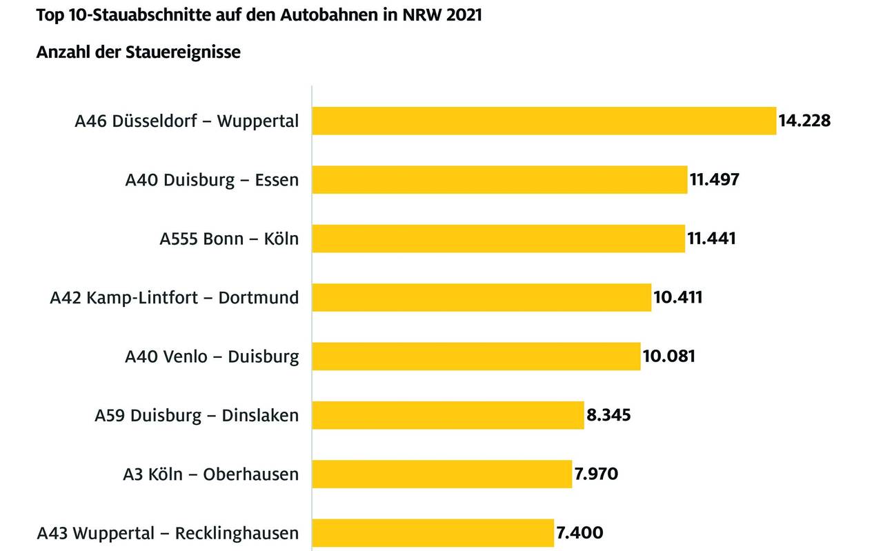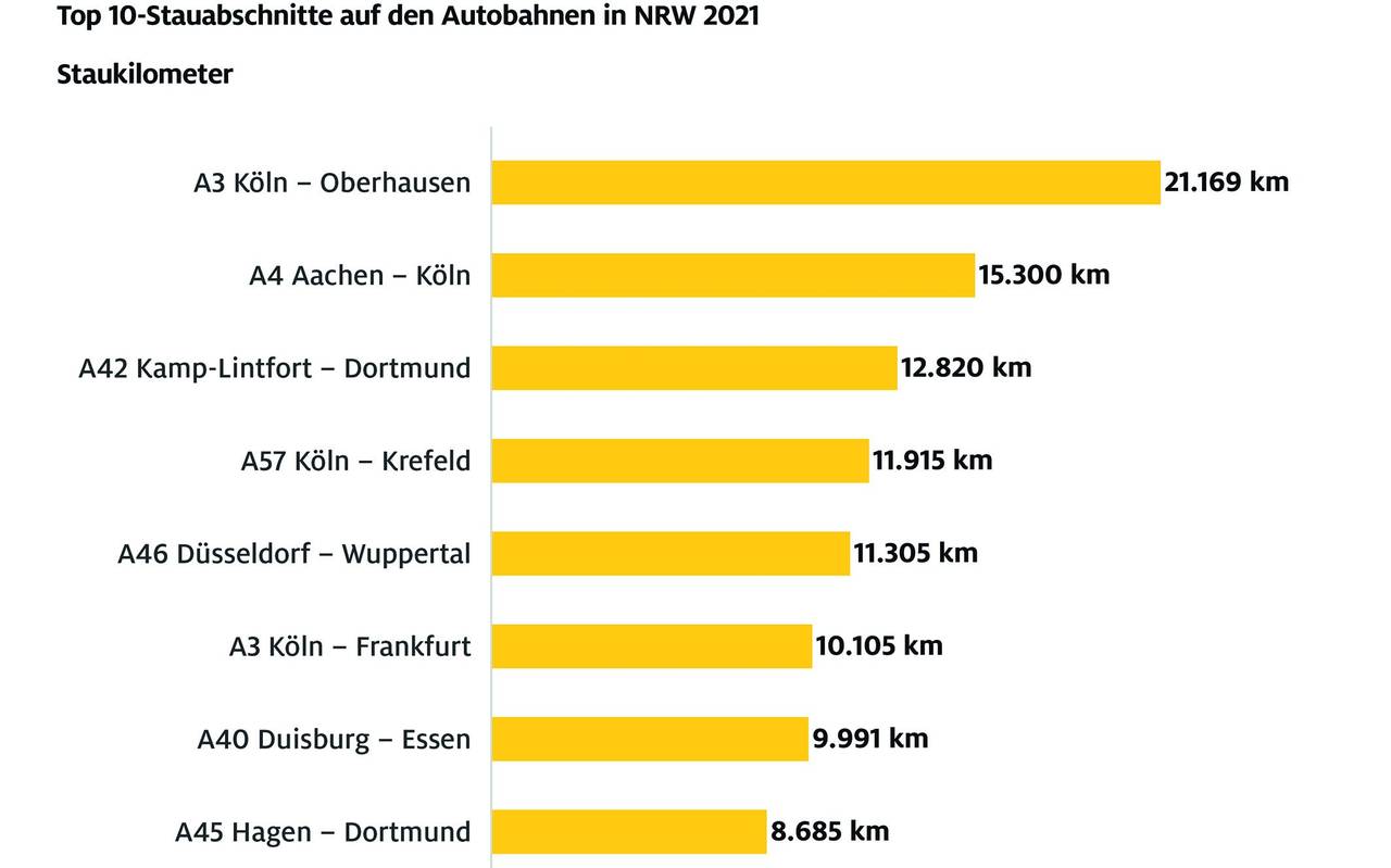 Besonders ausgeprägte Stauspitzen hat der ADAC im letzten Jahr auf der A3 zwischen Duisburg-Wedau und Oberhausen-Lirich ausgemacht, genauso zwischen Kreuz Oberhausen und Oberhausen-Holten. Ausreißer gab es zum Beispiel auch auf der A40 in Duisburg und Essen sowie auf der A42 in Herne.