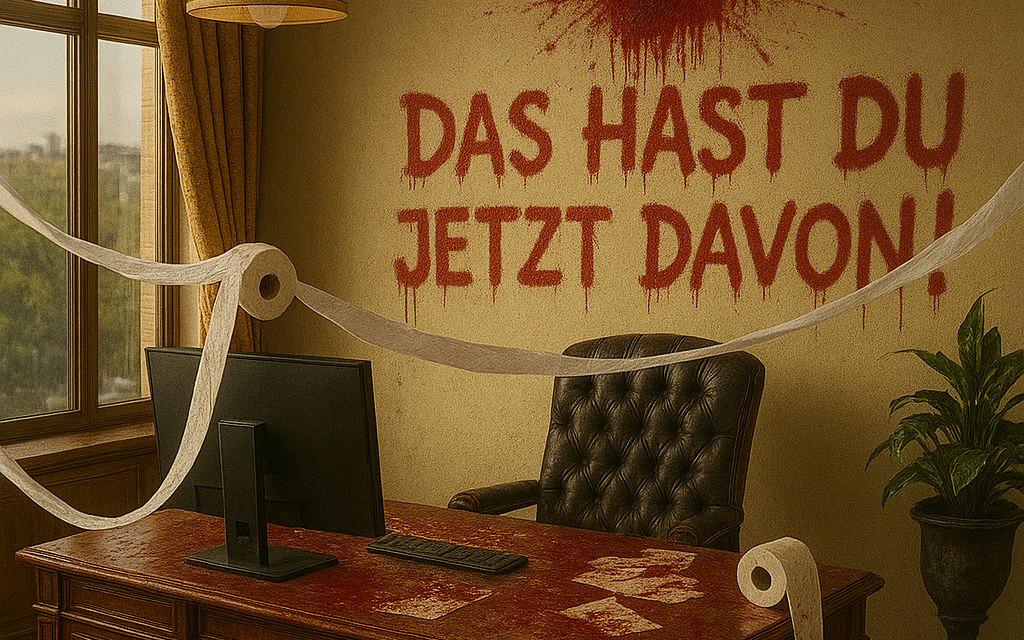 Heute Morgen gab’s den großen Schock: Das Büro des Chefs ist komplett verwüstet. Scheuermilch quer an den Wänden, Klopapier überall im Raum verteilt, Kunstblut auf allen Möbeln und an den Wänden steht in rot geschrieben: „Das hast du jetzt davon!“