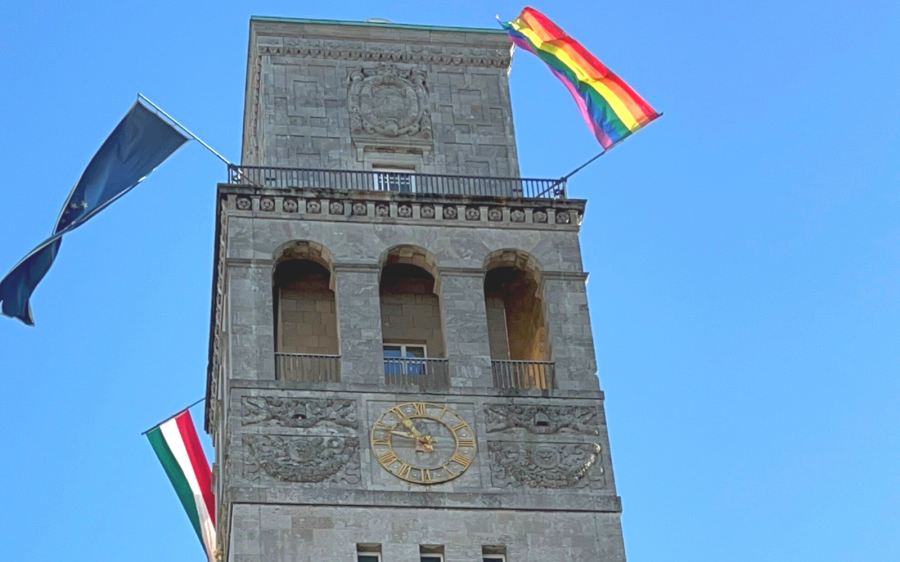 Anlässlich des internationalen Tages gegen Homo-, Bi-, Inter- und Transfeindlichkeit ("IDAHOBIT") ist heute der Rathausturm in Mülheim beflaggt.
