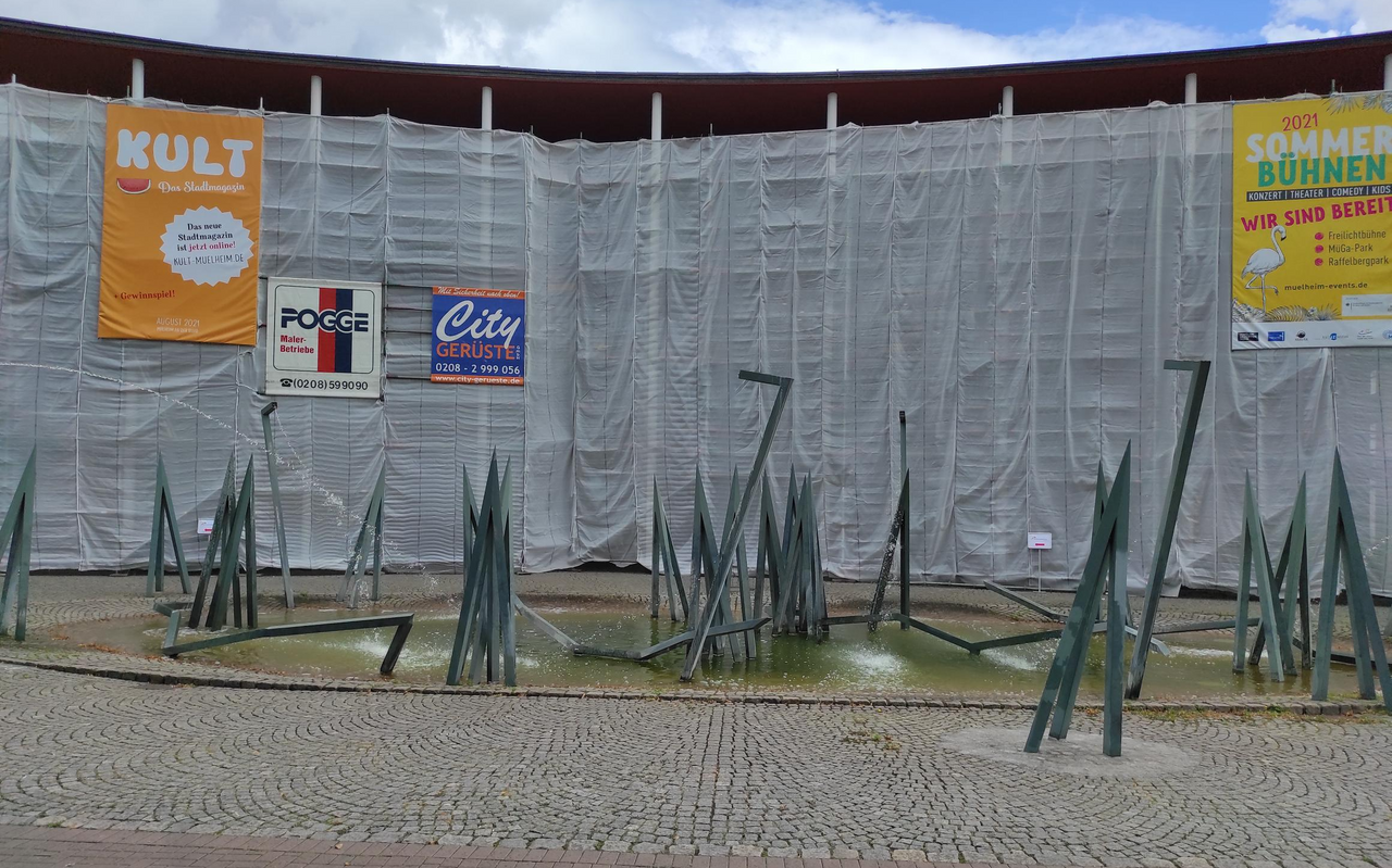 Aktuell ist der Eingang der Mülheimer Stadthalle verhüllt. Ein Gerüst ist aufgebaut, über das eine Plane gespannt ist. Wir haben in den letzten Wochen den Eingang der Stadthalle auf Vordermann bringen lassen, sagt die Mülheimer Stadtmarketing und Tourismusgesellschaft MST.