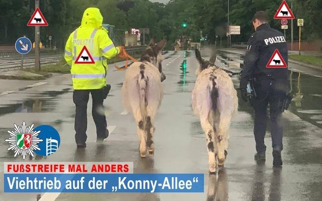 Die Polizei Oberhausen war heute Morgen mit zwei ausgebüxten Eseln auf der Konrad-Adenauer-Allee unterwegs. Die Beamten haben die Tiere an der Leine über die gesperrte Fahrbahn geführt und zurück zum Kaisergarten gebracht.