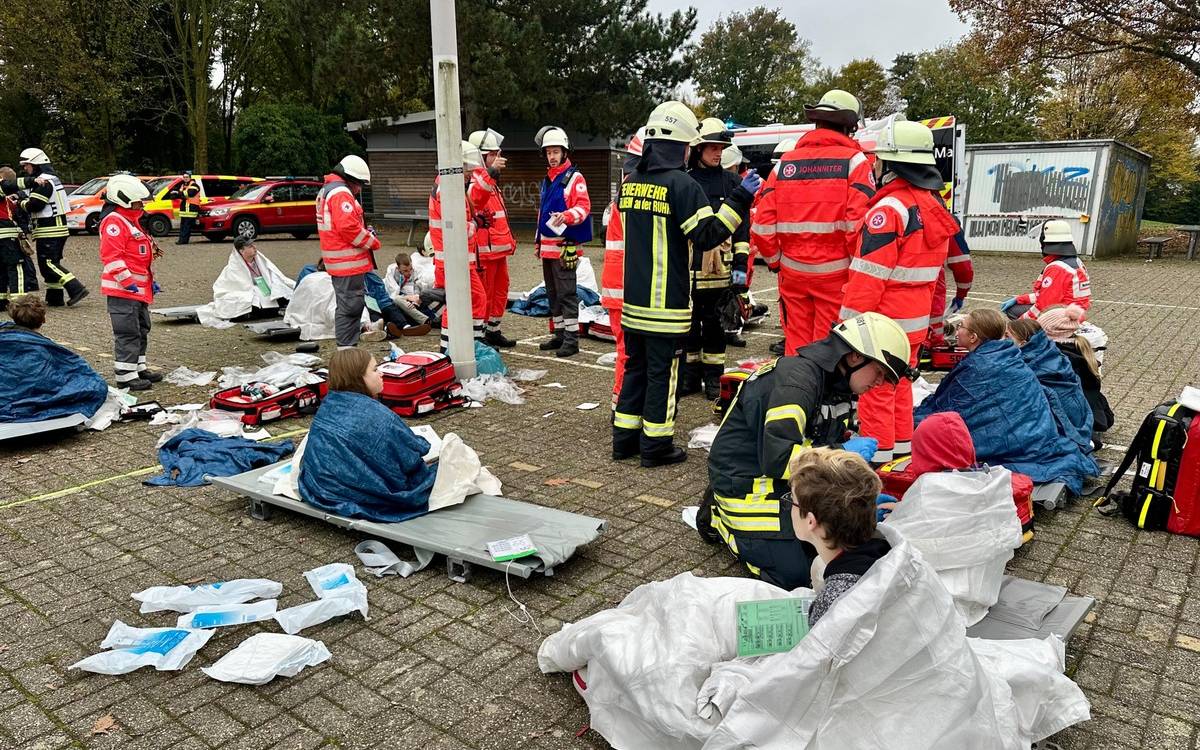 Über 250 Menschen haben an der Übung teilgenommen. Neben Feuerwehrkräften aus Mülheim, Oberhausen und Duisburg auch die Hilfsorganisationen Johanniter, Malteser, ASB, Deutsches Rotes Kreuz und die Notfallseelsorge. Zahlreiche Kinder, Jugendliche und Lehrer waren als Schauspieler in die Rollen der Opfer geschlüpft. Sie waren entsprechend geschminkt worden und hatten geschrien und gezittert, um bei den Einsatzkräften für zusätzlichen Stress zu sorgen. Unter dem Strich waren die Einsatz- und Teamleistung sehr gut, sagt die Feuerwehr. Noch ist die Übung nicht komplett ausgewertet. Die Feuerwehr trainiert alle zwei Jahre in so einem großen Rahmen. Geübt werden immer wieder andere Szenarien.