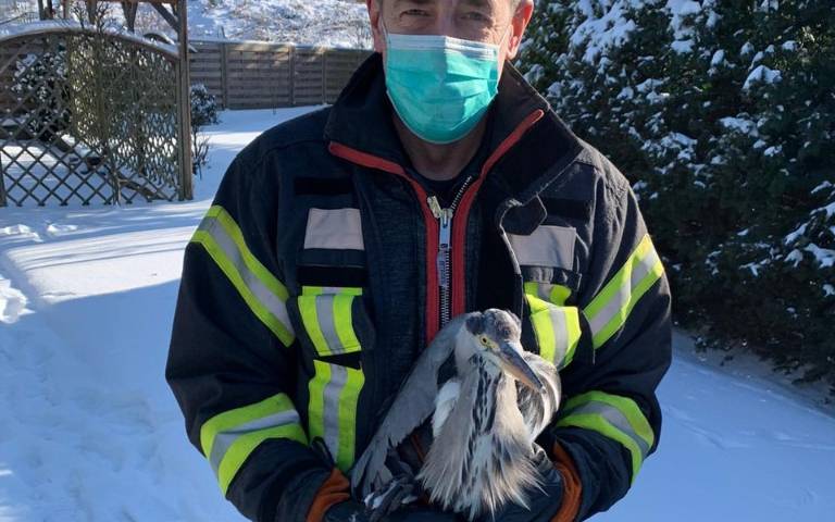 Auch einem Fischreiher rettete die Feuerwehr heute das Leben. In einem Garten war ein Fuß des Tieres im Eis festgefroren. Ein Feuerwehrmann wärmte den Fuß mit seinen Handschuhen und taute damit das Eis auf. Der Fischreiher wurde zur Sicherheit erstmal in eine Tierklinik gebracht.