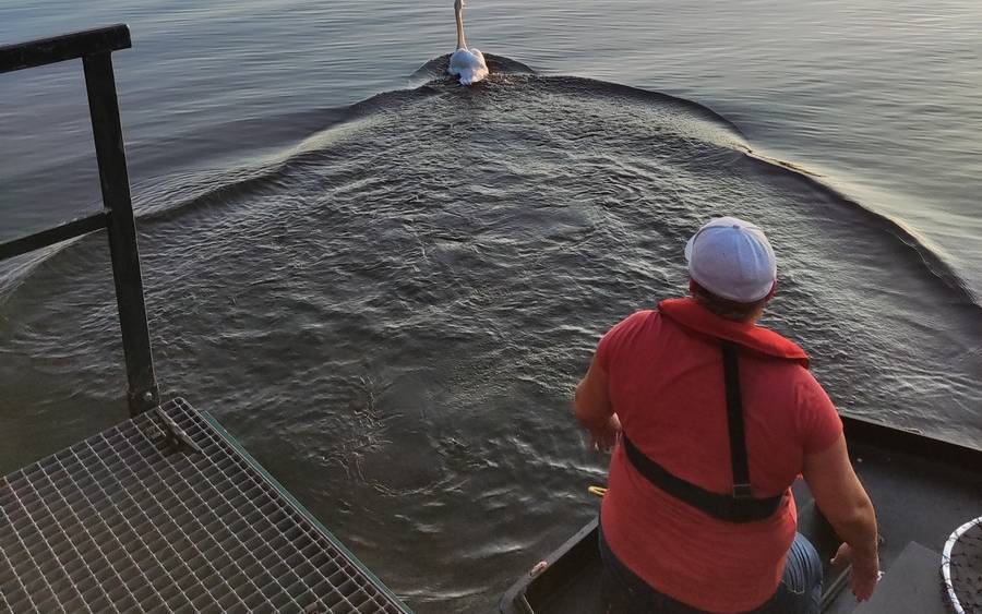 Bei Eintreffen der ersten Einsatzkräfte hatte sich einer der beiden Schwäne schon selbst aus seiner misslichen Lage befreien können und war bereits davongeflogen. Um auch das zweite Tier aus seiner Notlage zu befreien, wurde ein DLRG-Rettungsboot zu Wasser gelassen. Zusammen mit der begeisterten Naturschützerin konnte der Schwan eingefangen werden und von der Angelschnur befreit werden. Die Schnur hatte sich um den Flügel sowie um den Hals herumgewickelt. Der augenscheinlich unverletzte Schwan wurde anschließend wieder in die Freiheit entlassen.