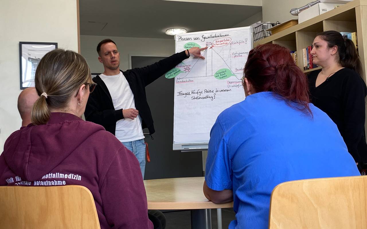 Wer aber Action, Rollenspiele und Karate-Skills sucht, ist im Deeskalationstraining falsch. In dem Kurs geht es vielmehr darum, Situationen so zu meistern, dass sie erst gar nicht eskalieren. Auf Details achten, das ist Trainer Dennis von Heesen ganz wichtig. Hat der Patient eine Lieblingsband? Einen Fußballverein? “Oft sind es keine großen Formeln, sondern ganz viel Einfaches aus dem Alltag.” Oft habe man allein durch etwas Smalltalk aufgeheizte Situationen beruhigen können - mit Empathie gehe vieles, sagt Dennis.