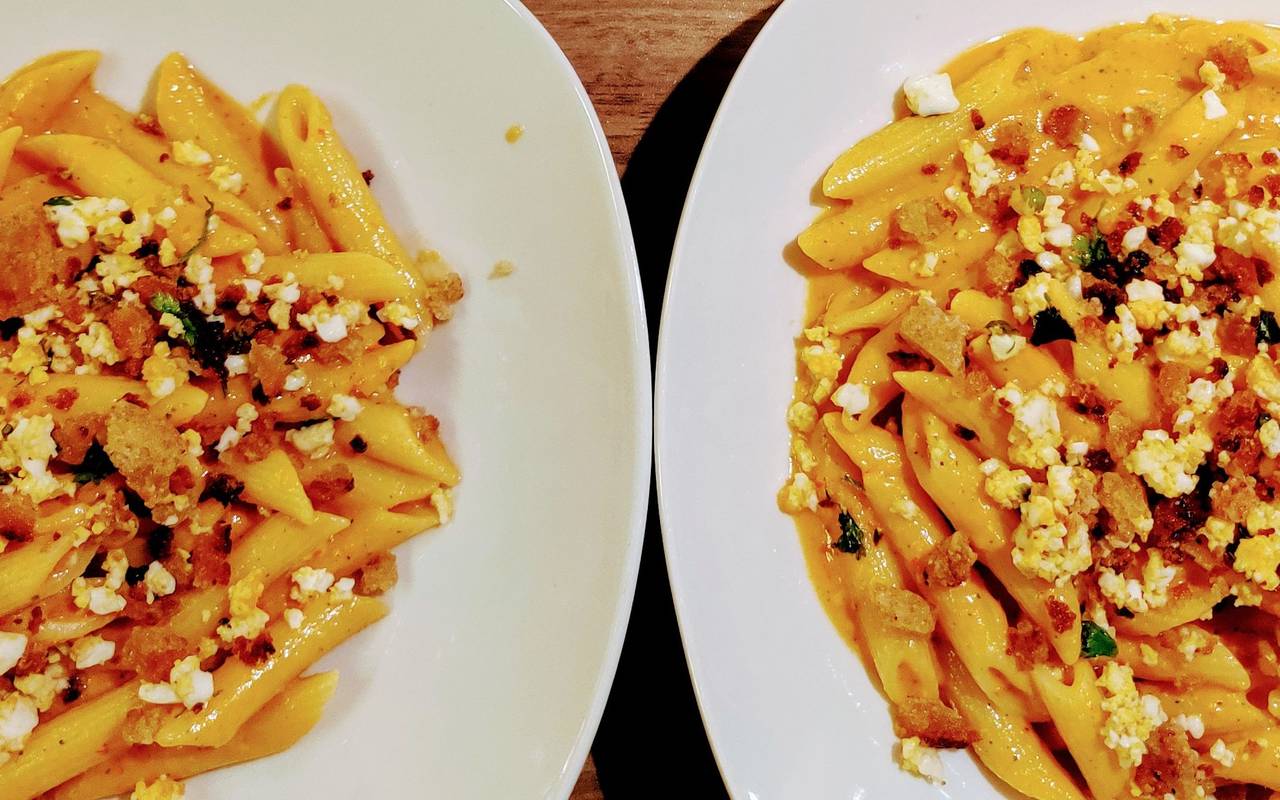 Gazpacho-Nudeln mit Tofu-Bröseln