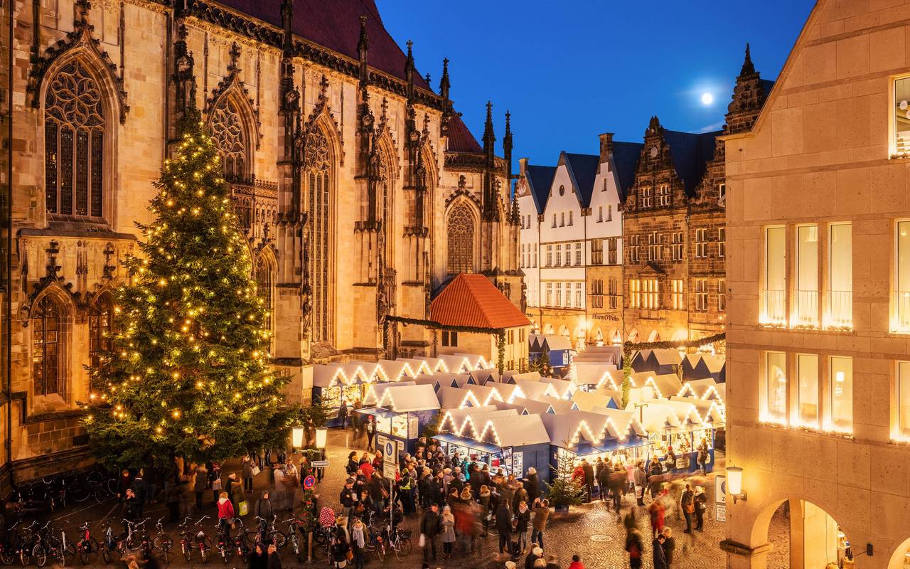 Weihnachtsmarkt-Kette - In Münsters Innenstadt gibt es selbstverständlich auch Weihnachtsstimmung, die verbreitet wird. Der große Unterschied zu anderen Städten und Kreisen. Es gibt nicht nur den einen Weihnachtsmarkt, sondern mehrere. Insgesamt gibt es sechs. Sie erstrecken sich quer durch den Kern der Stadt und verwandeln Münsters Innenstadt in ein Winter-Wonderland. Rund 300 Stände - verteilt auf die verschiedenen Märkte - laden zu einem ausgiebigen Weihnachtsmarkt-Bummel ein. Und, weil jeder Markt auch noch einmal seine eigenen Besonderheiten hat, ist da auch wirklich für jeden Besucher und jede Besucherin was dabei. Für das leibliche Wohl ist gesorgt. Start der Weihnachtsmärkte ist am 25. November, bis zwei Ausnahmen laufen alle bis zum 23. Dezember durch.