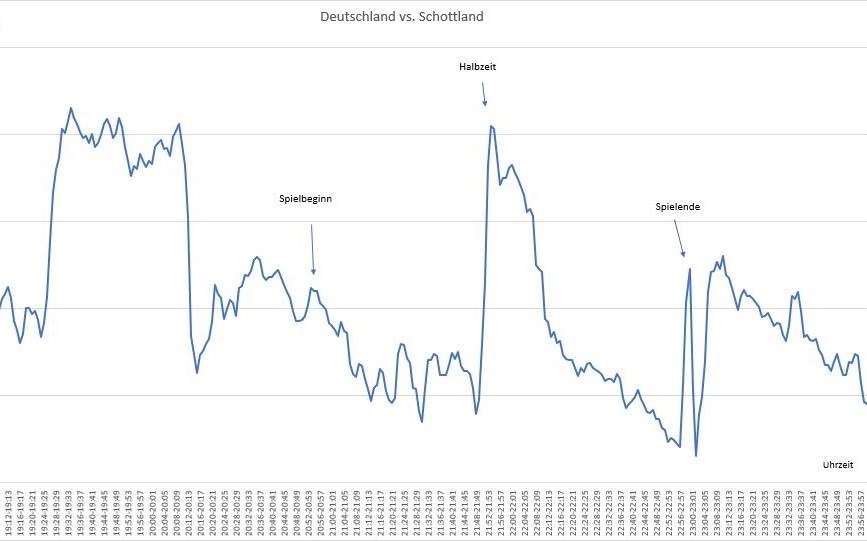 RWW hat das Phänomen bei der Partie Deutschland gegen Schottland exemplarisch für sein Versorgungsgebiet untersucht. Bei diesem Spiel lag der stündliche Verbrauch vor dem Spiel im Versorgungsgebiet bei 6.200 Kubikmetern. Innerhalb weniger Minuten stieg der Verbrauch zur Halbzeitpause um rund 27 Prozent auf 7.800 Kubikmeter an. RWW sagt, dass das Phänomen überhaupt kein Problem für Leitungen und Anlagen darstellt. Genau für solche Spitzen sei alles ausgelegt.