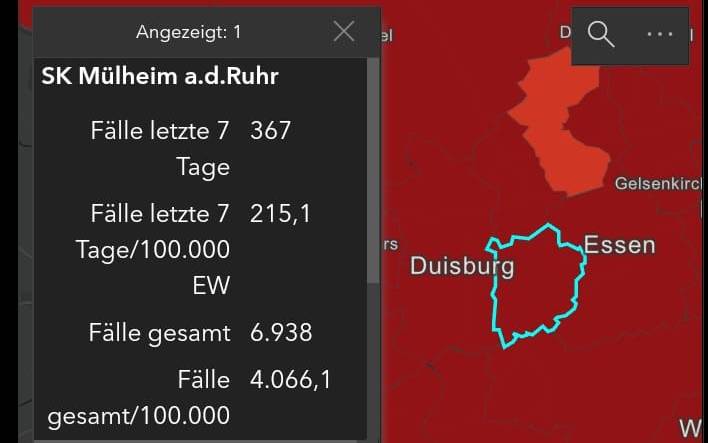 In Mülheim gibt es jetzt 215,1 Neuinfektionen pro 100.000 Einwohner innerhalb von 7 Tagen. Damit haben wir bei der Inzidenz nach der 100er-Marke auch den zweiten kritischen Wert von 200 überschritten.