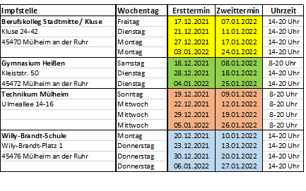 Sie bekommen einen speziell abgestimmten Stoff der Firma BioNTech. Geimpft wird an der Willy-Brandt-Schule, dem Technikum in der Speldorfer Parkstadt, im Gymnasium Heißen und im Berufskolleg Stadtmitte. Termine gibt es nicht. Deshalb könnten Wartezeiten entstehen, heißt es. Aus Sicherheitsgründen werden an diesen Impfstellen ausschließlich Kinder geimpft. Ein Kinderarzt oder eine -ärztin sollen immer anwesend sein. Das Angebot soll das Angebot der Kinder- und Jugendärzte ergänzen.