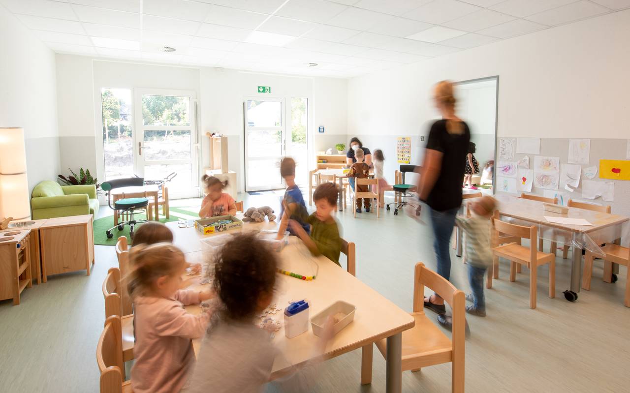95 Kinder im Alter ab vier Monaten können hier aufgenommen werden. Die Bauherren loben das Projekt als bunt und baulich sehr modern. Die Arbeiten laufen aber noch weiter. Die Außenanlagen sind noch nicht ganz fertig. Außerdem müssen die anliegenden Doppelhäuser der MWB noch an die Käufer übergeben werden. Das soll im Herbst passieren.