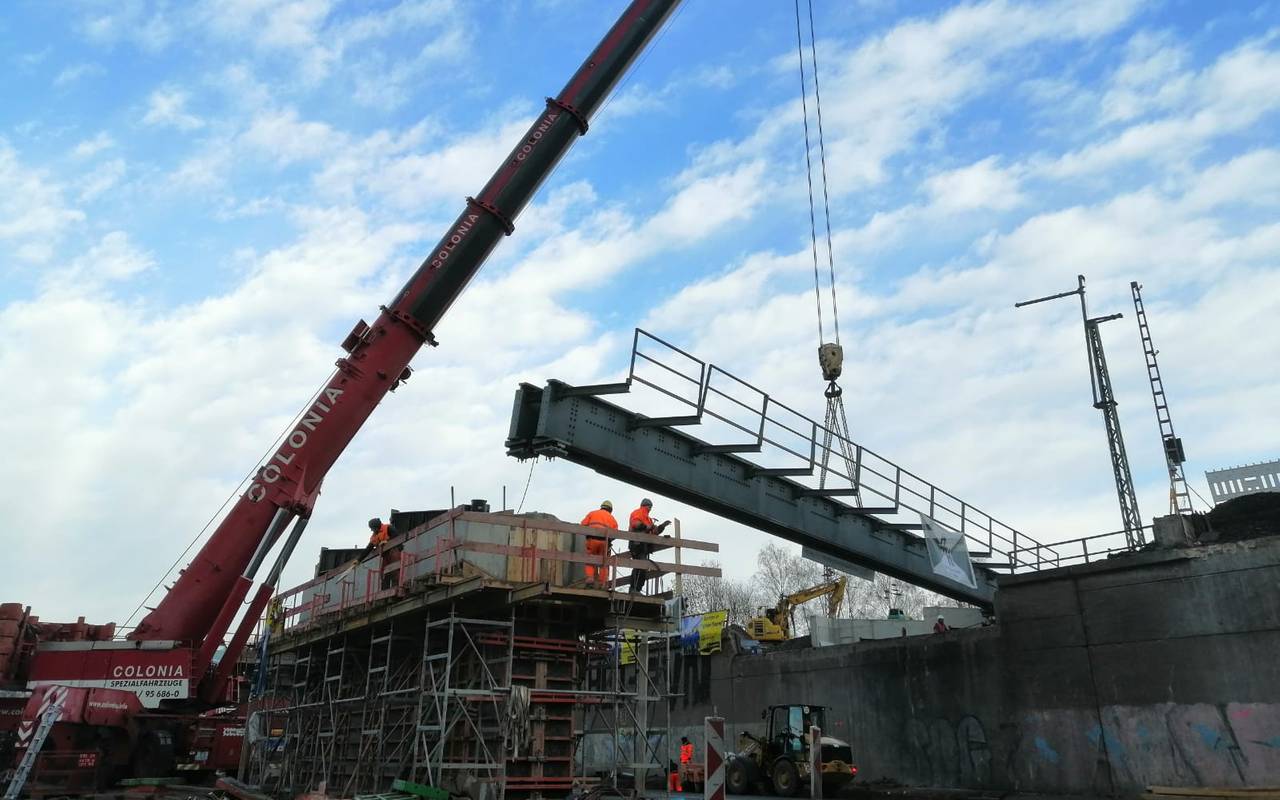 Die Bahn startet heute Nachmittag (10.12.) mit dem Bau der Hilfsbrücke über die A40. Dazu hebt ein großer Kran vier Brückenteile in Position. Geplant ist das für heute und morgen. Das braucht etwas Zeit, weil die Teile jeweils 26 Meter lang sind und rund 80 Tonnen wiegen, sagt die Bahn. Sobald die Teile sich an der richtigen Stelle befinden, müssen Arbeiter sie verankern.