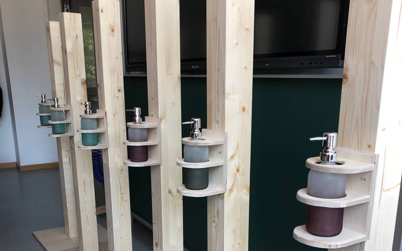 Die Willy-Brandt-Gesamtschule hat für alle Schüler und Lehrer FFP2-Masken besorgt. Der Mülheimer Apotheker Patrick Marx hat sie der Schule gespendet: insgesamt 2.000 Stück. Außerdem stellt er der Schule Desinfektionsmittel zur Verfügung. Die passenden Spender dafür hat die Schule selbst gebaut. Der Fachbereich Technik hat für jeden Eingang einen Desinfektionsmittelspender aus Holz angefertigt.