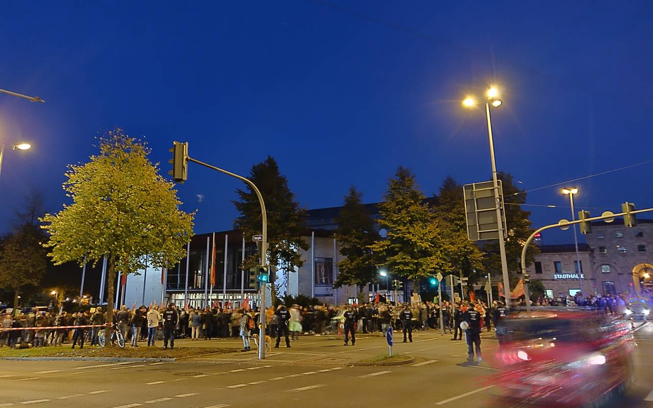 Die Täter bekamen von der Polizei Platzverweise. Mehrere tausend Menschen hatten gestern an Demonstrationen vor der Stadthalle und in der Innenstadt teilgenommen. Darunter Vertreter aus Politik, Kirche, jüdischer Gemeinde, Vereinen und Sozialverbänden.