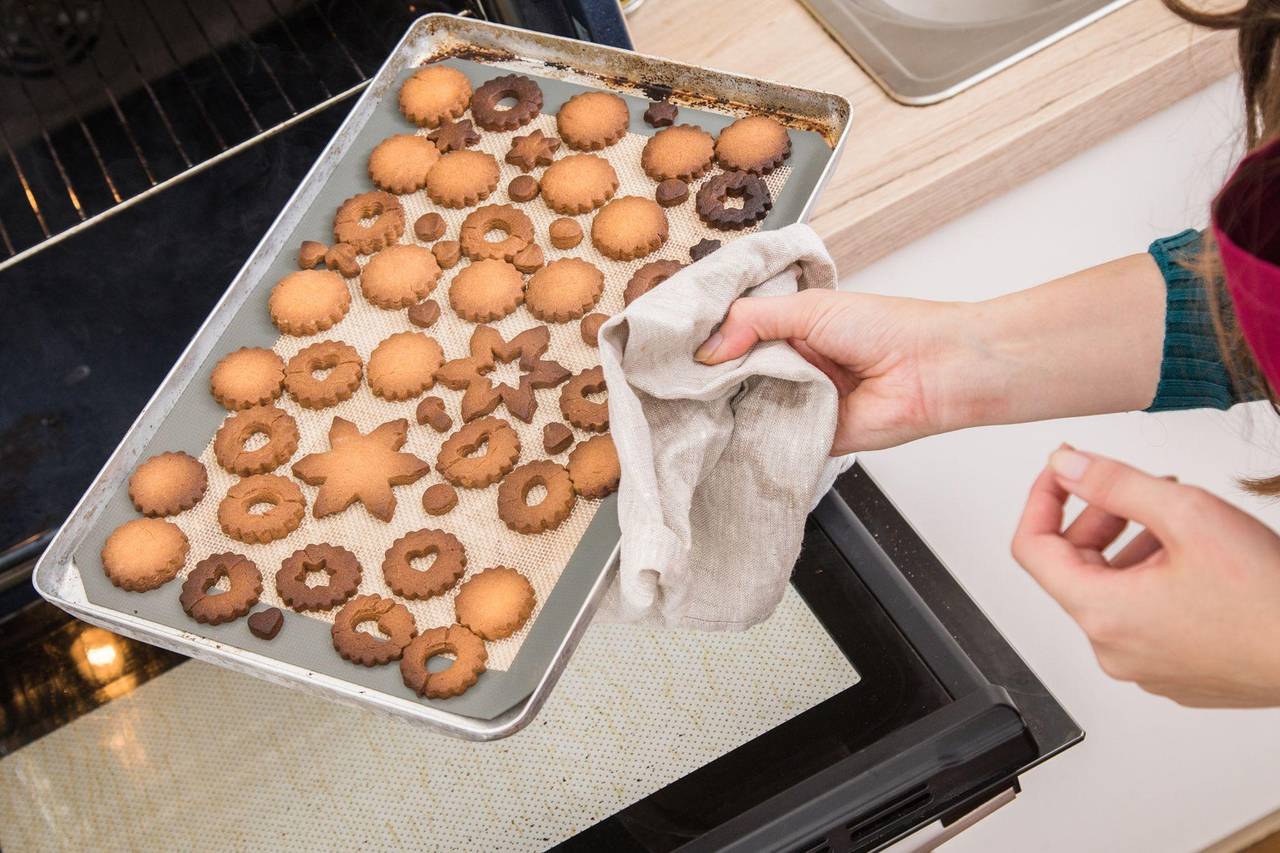 Den Teig zugedeckt für 30 Minuten kaltstellen. Danach diesen circa vier bis fünf Millimeter dick ausrollen. Kekse in verschiedenen Formen ausstechen und diese auf ein mit Backpaper ausgelegtes Backblech legen. Im vorgeheizten Backofen bei 180 Grad Ober-/Unterhitze für circa 15 Minuten backen.