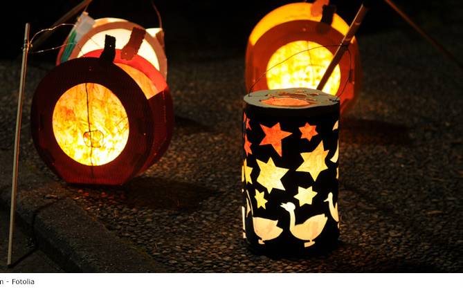 Motorradfahrer fährt quer durch Martinsumzug