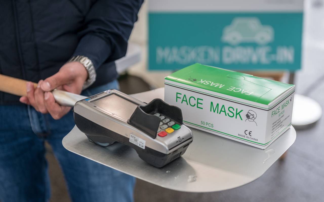 Kunden können mit dem Auto an eine provisorische Theke fahren. Wegen des Corona-Sicherheitsabstands bekommen sie die Masken auf einem Spaten vom Mitarbeiter durch´s Autofenster gereicht. Bezahlen geht per EC-Karte, aber auch in bar. Es gibt einfache Einwegmasken im 50er Pack für 60 Euro. Außerdem KN95-Masken - ein chinesisches Maß, das dem FFP2-Standard ähnelt - jeweils fünf Stück für 40 Euro. Der Masken-Drive-in ist auf dem Parkplatz des "Alles klar!"-Verleihs in der Witzlebenstraße 16 zu finden.