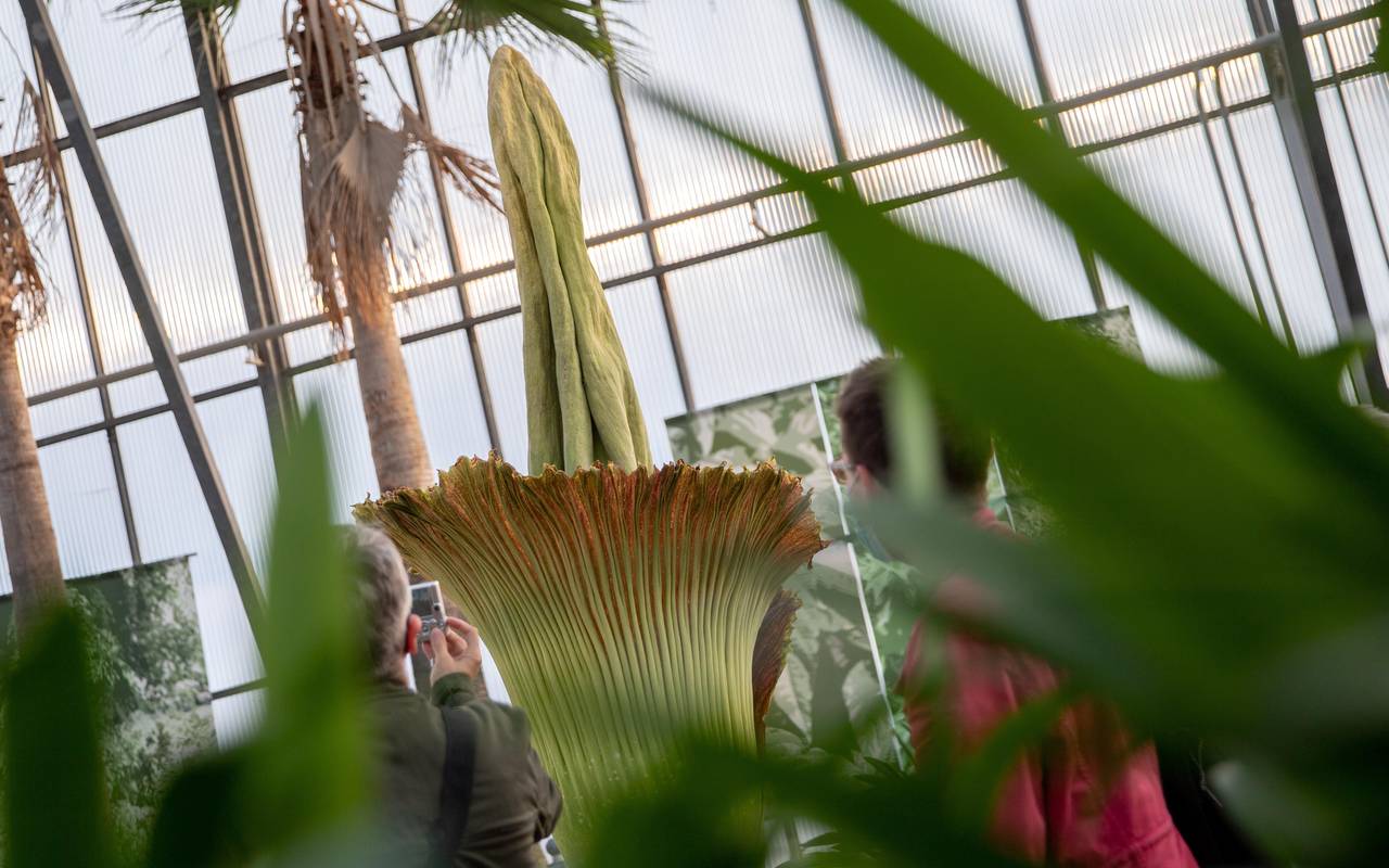 Die Pflanze blüht nur alle drei bis fünf Jahre. Die Blüte ist dann auch nur für maximal 48 Stunden zu sehen. In Bochum war das zuletzt sogar vor fast acht Jahren der Fall. Damals lockte das Ereignis regelrechte Menschenmassen in den Botanischen Garten. Für empfindliche Nasen ist die Titanwurz-Blüte aber nicht gedacht. Der Botanische Garten beschreibt den Geruch als eine Mischung aus Limburger Käse, verfaulendem Fisch und verschwitzten Socken. Durch den Duft lockt die Pflanze Insekten an, die für die Bestäubung sorgen sollen. Hier gibt es aktuelle Infos, wann genau die Blüte zu sehen sein wird. Im Grugapark in Essen blühte eine Titanwurz-Pflanze zuletzt vor drei Jahren.