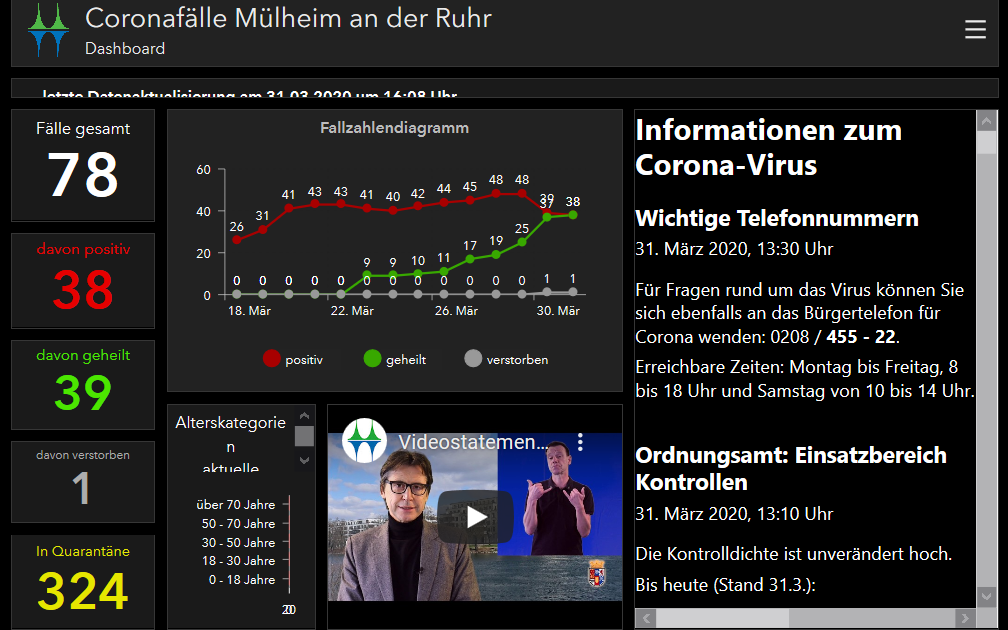 Auf dem Dashboard gibt es zum Beispiel eine Grafik mit zwei Kurven. Die rote Kurve zeigt die Entwicklung der Infizierten-Zahlen. Die grüne die der wieder genesenen Patienten. Außerdem sehen wir, in welcher Altersklasse gerade wie viele Mülheimer mit dem Coronavirus infiziert sind. Auch wichtige Informationen und die neueste Videobotschaft von Stadtdirektor Steinfort befinden sich auf dem neuen Dashboard. Ebenso natürlich die aktuellen Fallzahlen. Den Link zum neuen Dashboard gibt es hier.