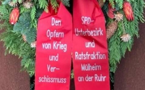 Die Polizei prüft, ob sie die Ermittlungen im Fall der falsch beschrifteten Schleife auf einem Trauerkranz der Mülheimer SPD einstellt. Es hat sich rausgestellt, dass es sich bei der Aufschrift "Verschissmuss" mit "V" und doppelter Verwendung der Buchstaben "SS" um einen unglücklichen Fehler handelt, heißt es als Begründung.
