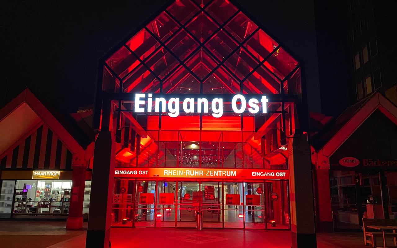 Mit Einbruch der Dunkelheit leuchtet heute Abend der Eingang Ost des Rhein-Ruhr Zentrums in rot. Damit will das Einkaufszentrum auf die schwierige Lage der Händler aufmerksam machen. Außerdem werben die Betreiber damit kurz vor der anstehenden Konferenz von Bund und Ländern übermorgen dafür, dass der Einzelhandel schnell wieder aufmachen darf.
