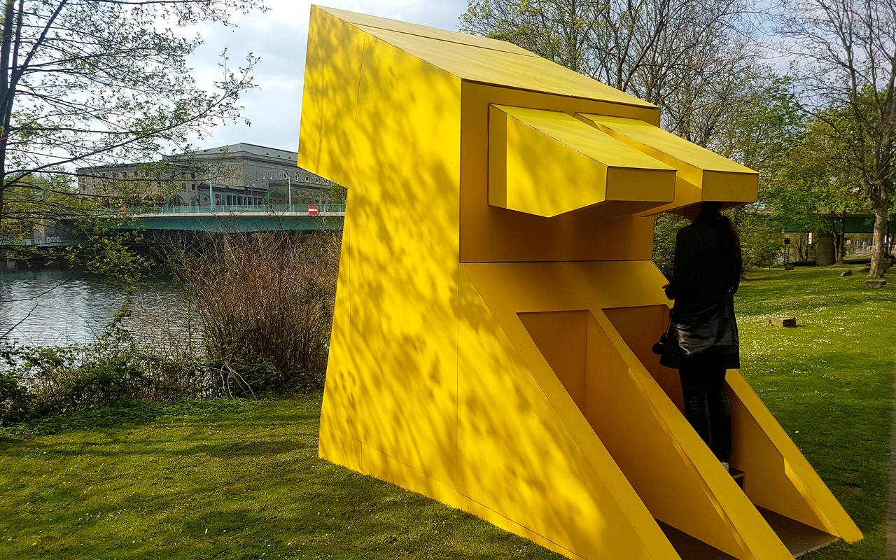 An der Ruhrpromenade haben Künstler zwischen Wasserbahnhof und Schloßbrücke eine große gelbe Box aufgebaut. Sie arbeiten am Kunstprojekt „Die große Schere“. Es gehört zum Impulse Theater Festival, das jedes Jahr in Mülheim am Ringlokschuppen sowie in Düsseldorf und Köln stattfindet – eins der wichtigsten Treffen der Freien Theaterszene.