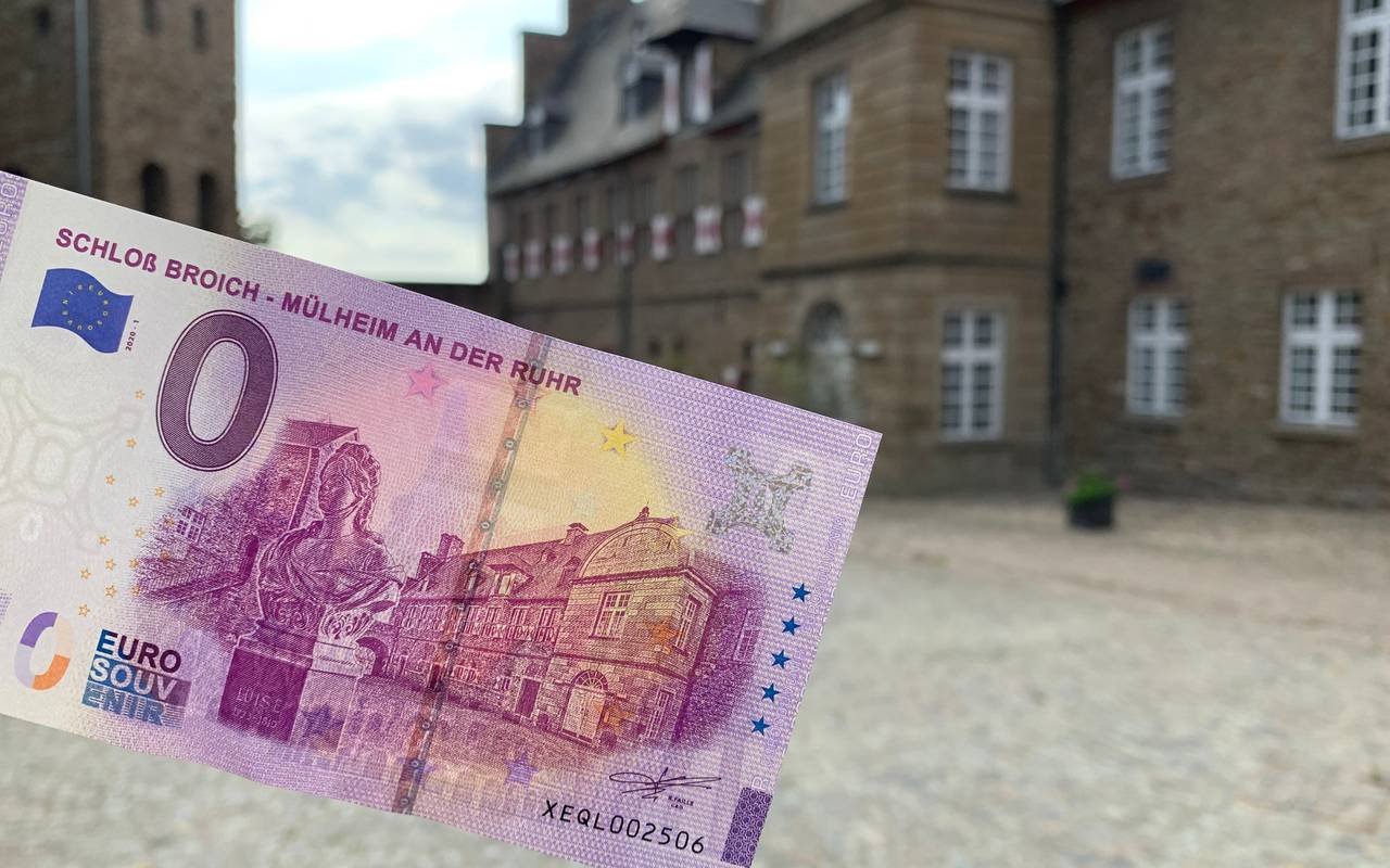 Mülheim hat ein neues Souvenir: einen violett gefärbten 0-Euro-Schein. Auf der Rückseite ist Schloß Broich und die Büste der preußischen Königin Luise abgebildet, heißt es vom Mülheimer Stadtmarketing.