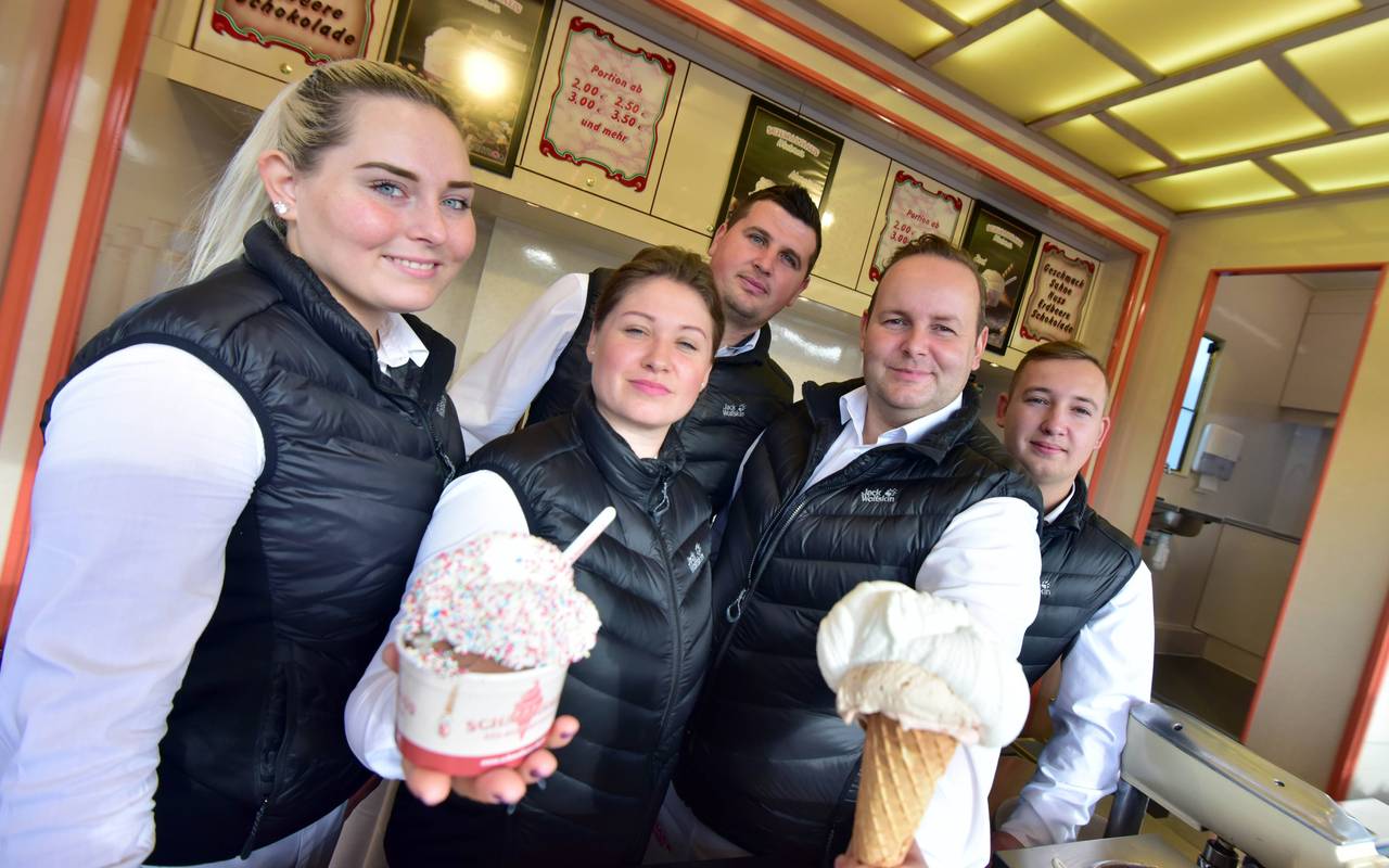 Bei den Planungen macht die aktuell geltende Corona-Verordnung aber noch Probleme: Im 50 Meter-Umkreis um die Verkaufswagen dürfte das Eis nicht gegessen werden. Das frische Sahneeis aus der Maschine eignet sich aber nicht zum Einpacken und Mitnehmen. Darum muss Krenz warten, bis die Corona-Regeln gelockert werden. Bis dahin bleibt Zeit, den passenden Standort für die zwei Schmalhaus Eiswagen zu finden. Im Winter hatte einer schon neben dem Riesenrad am Centro einen festen Platz.