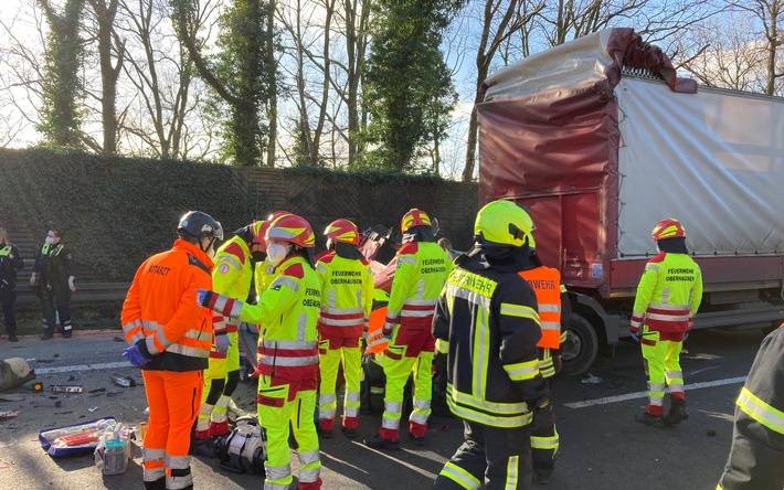 Der Fahrer des einen LKW war eingeklemmt und musste von den Rettungskräften herausgeschnitten werden. Er wurde danach mit einem Rettungshubschrauber in eine Duisburger Spezialklinik gebracht. Insgesamt 37 Einsatzkräfte waren vor Ort. Die Feuerwehr Oberhausen lobte, dass die Autofahrer rund um die Unfallstelle eine vorbildliche Rettungsgasse gebildet hatten.