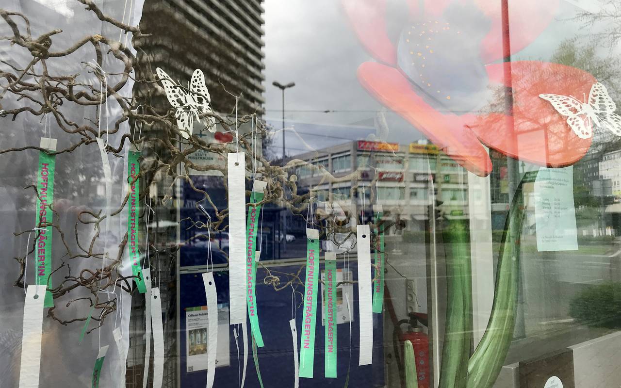 Die Evangelische Ladenkirche in Mülheim hat sich in der Corona-Pandemie was ausgedacht, um ein bisschen mehr Hoffnung zu verbreiten. Sie verteilt ab sofort in ihrem Lokal an der Kaiserstraße grüne Segensbänder. Besucher dürfen die Papierarmbänder einfach mitnehmen.