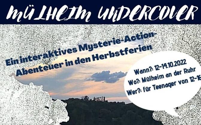 Ein Mystery-Abenteuer mit Rollenspiel können Jugendliche in der zweiten Woche der Herbstferien erleben. „Mülheim Undercover“ heißt das Action-Event, bei dem 12- bis 16- Jährige von Mittwoch (12.10.) bis Freitag eine moderne XXL-Schnitzeljagd durch die Stadt machen.