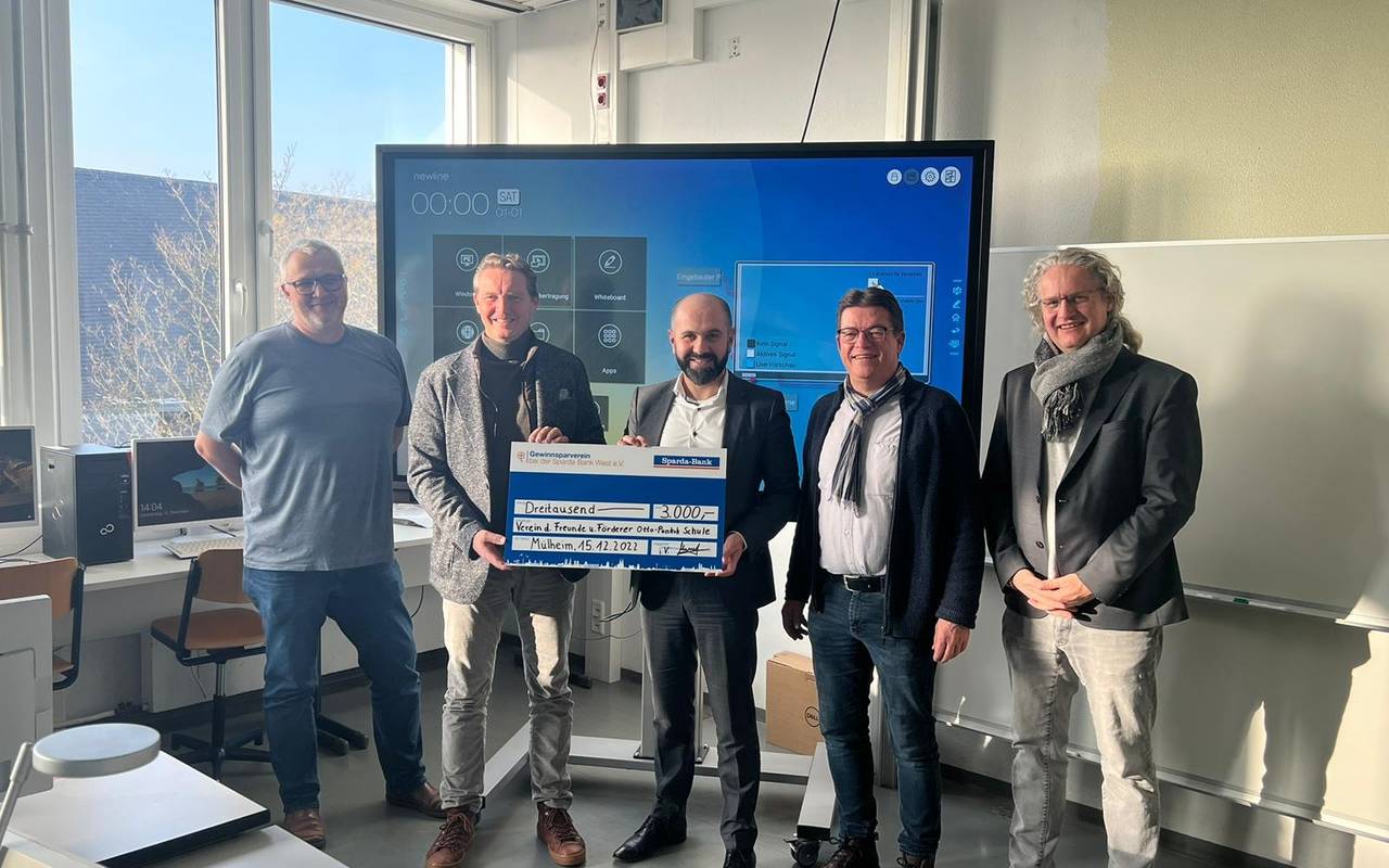 Die Sparda-Bank in Mülheim hat einen Scheck in Höhe von 3.000 an die Otto-Pankok-Schule überreicht. Von dem Geld sollen digitale Tafeln finanziert werden.