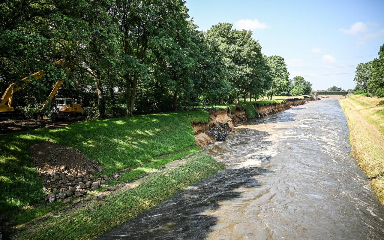 Das Unwetter heute Nacht sorgt für Probleme am Emscherdeich in Dinslaken. Der Pegel des Flusses ist durch den Starkregen im nördlichen Ruhrgebiet stark angeschwollen. Flussabwärts ist der Deich auf einer Länge von rund 300 Metern ausgewaschen.