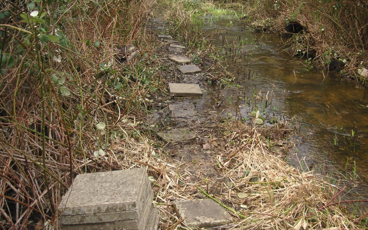 Das Mülheimer Umweltamt hat einen Bereich am Bühlsbach mit Flatterband abgesperrt. Unbekannte hatten dort anscheinend Flächen gerodet und dann entlang des Wasserlaufs Gehwegplatten ausgelegt.