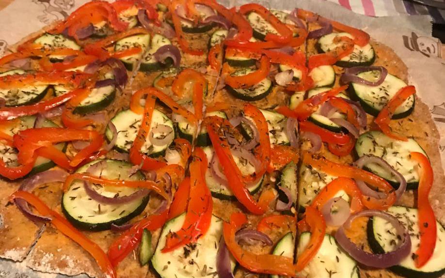 Bei dem Belag können wir nehmen was wir gerne mögen. Z.B: Paprika, Zucchini, Zwiebeln und Cherry-Tomaten. Ein bisschen Olivenöl drüber und ab in den Ofen. Geht super schnell und ist mega lecker.